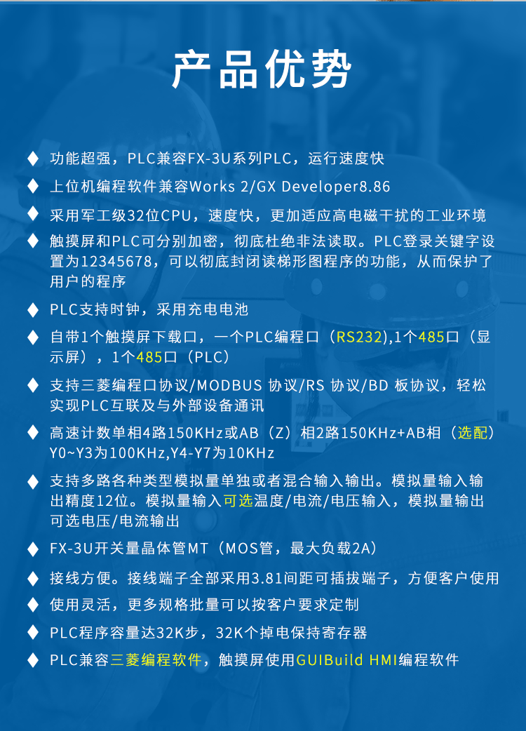 產(chǎn)品描述:PLC 兼容 FX-3U系列 PLC,運行速度快;上位機編程軟件兼容 Works 2/GX Developer8.86;觸摸屏和 PLC 可分別加密,徹底杜絕非法讀取...