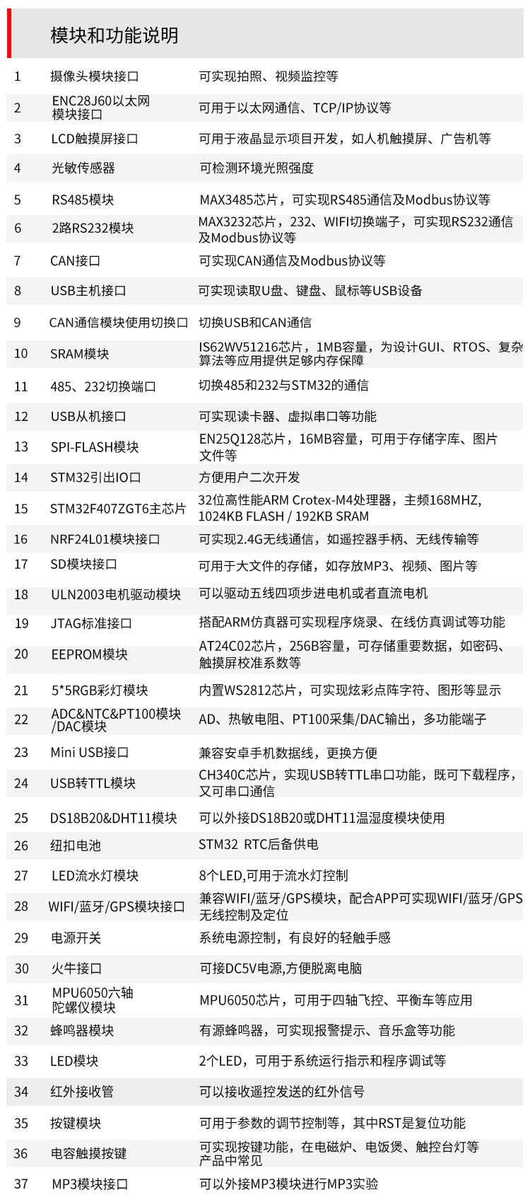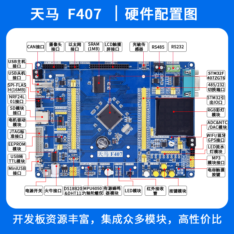 產(chǎn)品描述:帶有以太網(wǎng)/外部SRAM/USB/攝像頭/CAN/RS232/RS485/WIFI/藍(lán)牙/2.4G等硬件;配套Free RTOS/UCOS/STemWin/LwIP/RT-Thread/LittleVGL等軟件資料...
